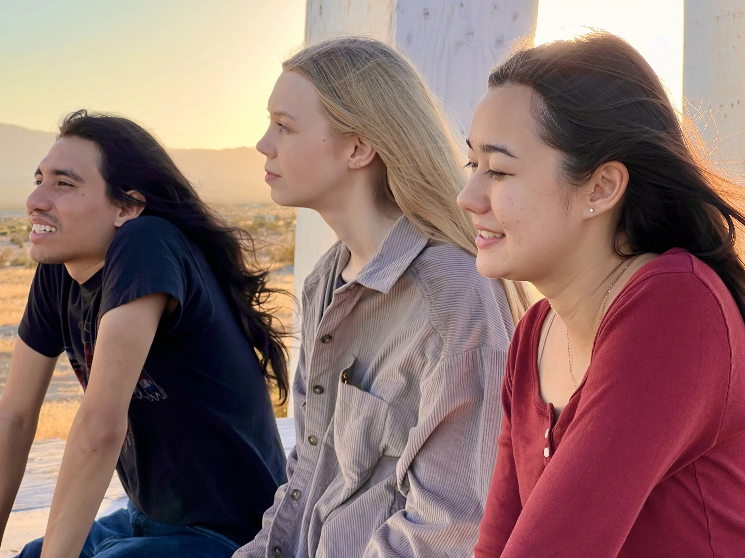 Filming for u r here was a whirlwind three days on the road between Los Angeles, Joshua Tree, Route 66, and Barstow. The cast dove in without hesitation as they navigated with a paper map, learned the nuance of playing a cassette tape on a boom box, and wrote notes, reflections, and post cards with a pen instead of thumbs.